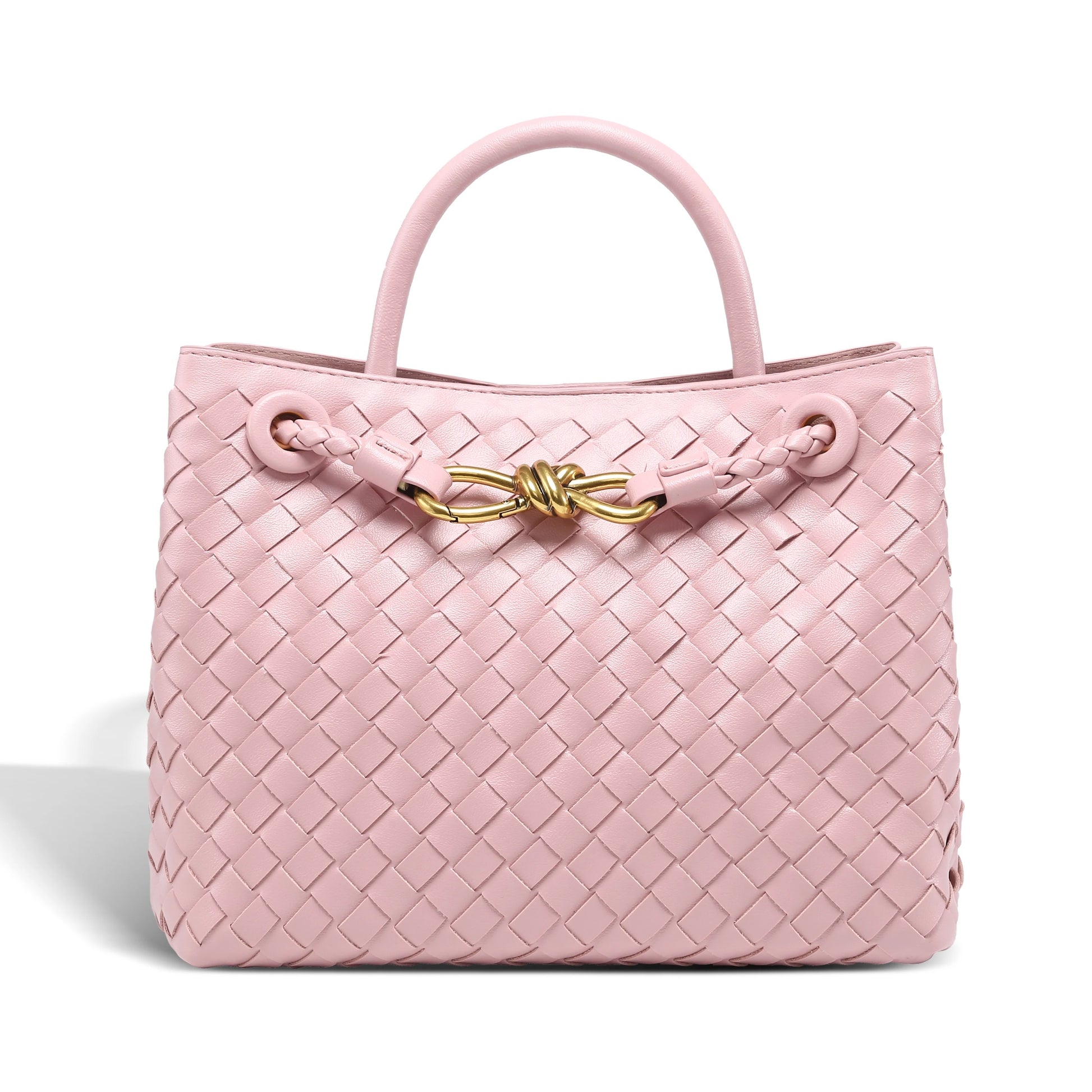 Borsa a mano in pelle vegana morbida a intreccio con tracolla, chiusura a clip.