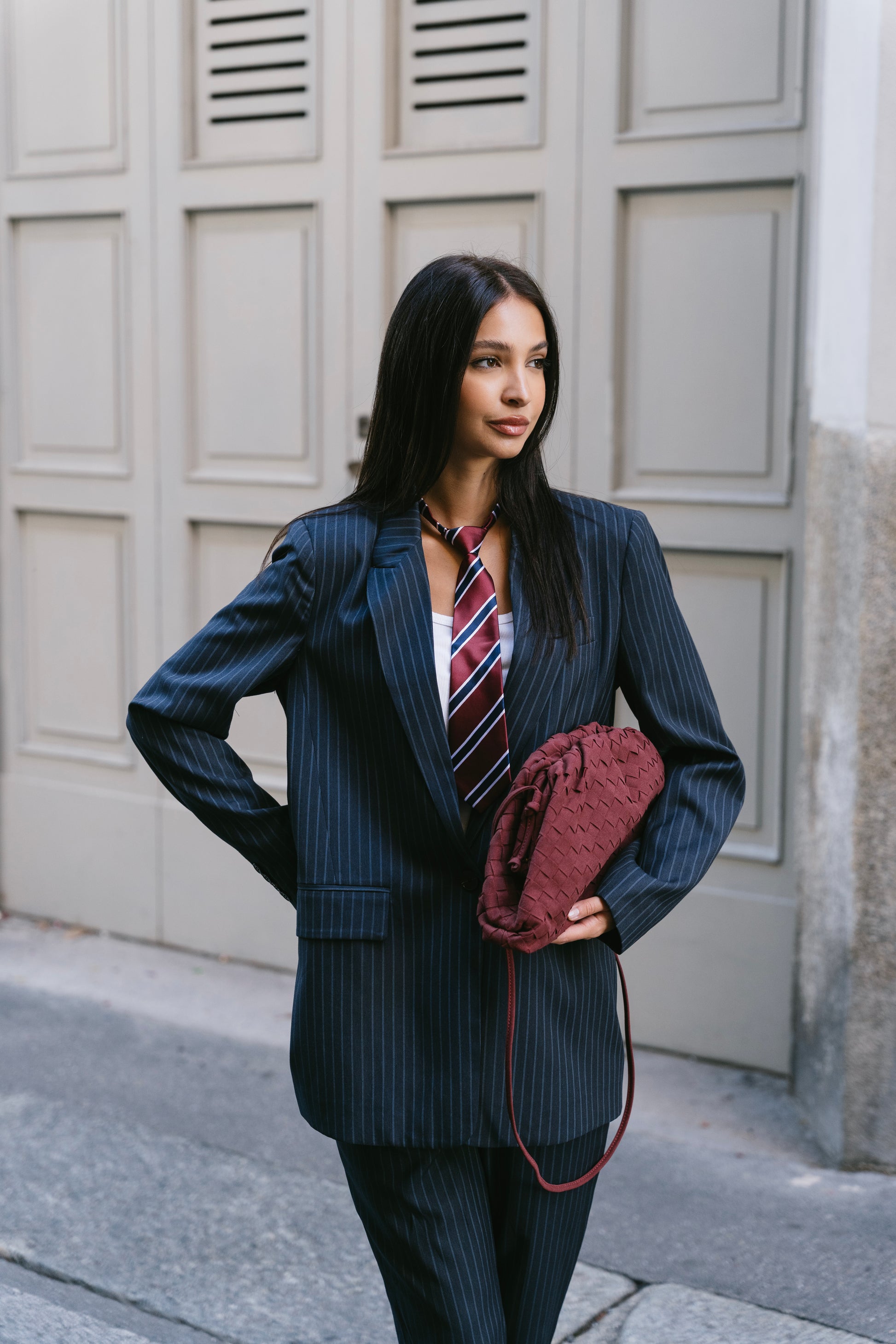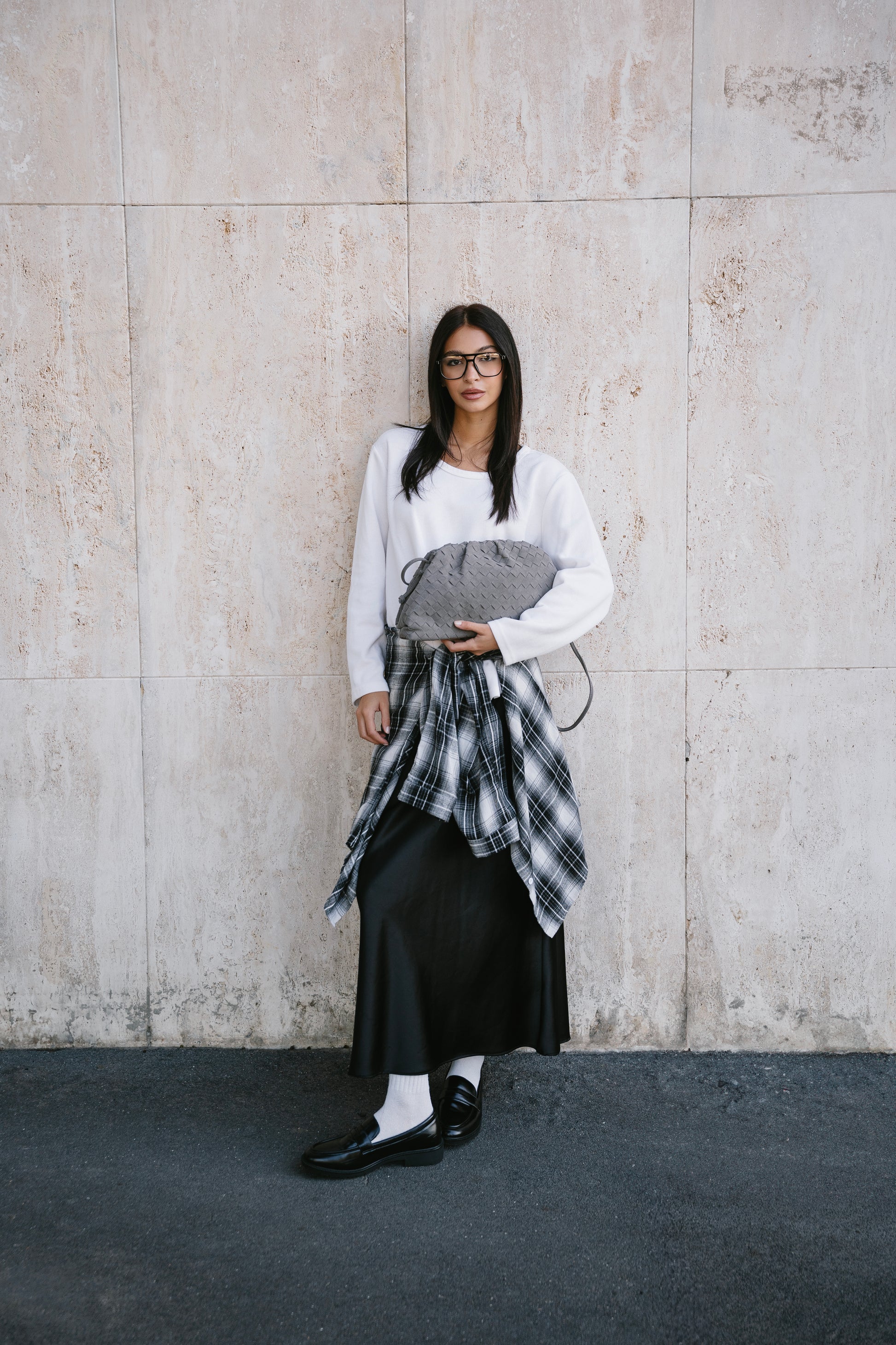 Clutch in pelle vegana ( velluto ) morbida a intreccio con tracolla, chiusura a clip.